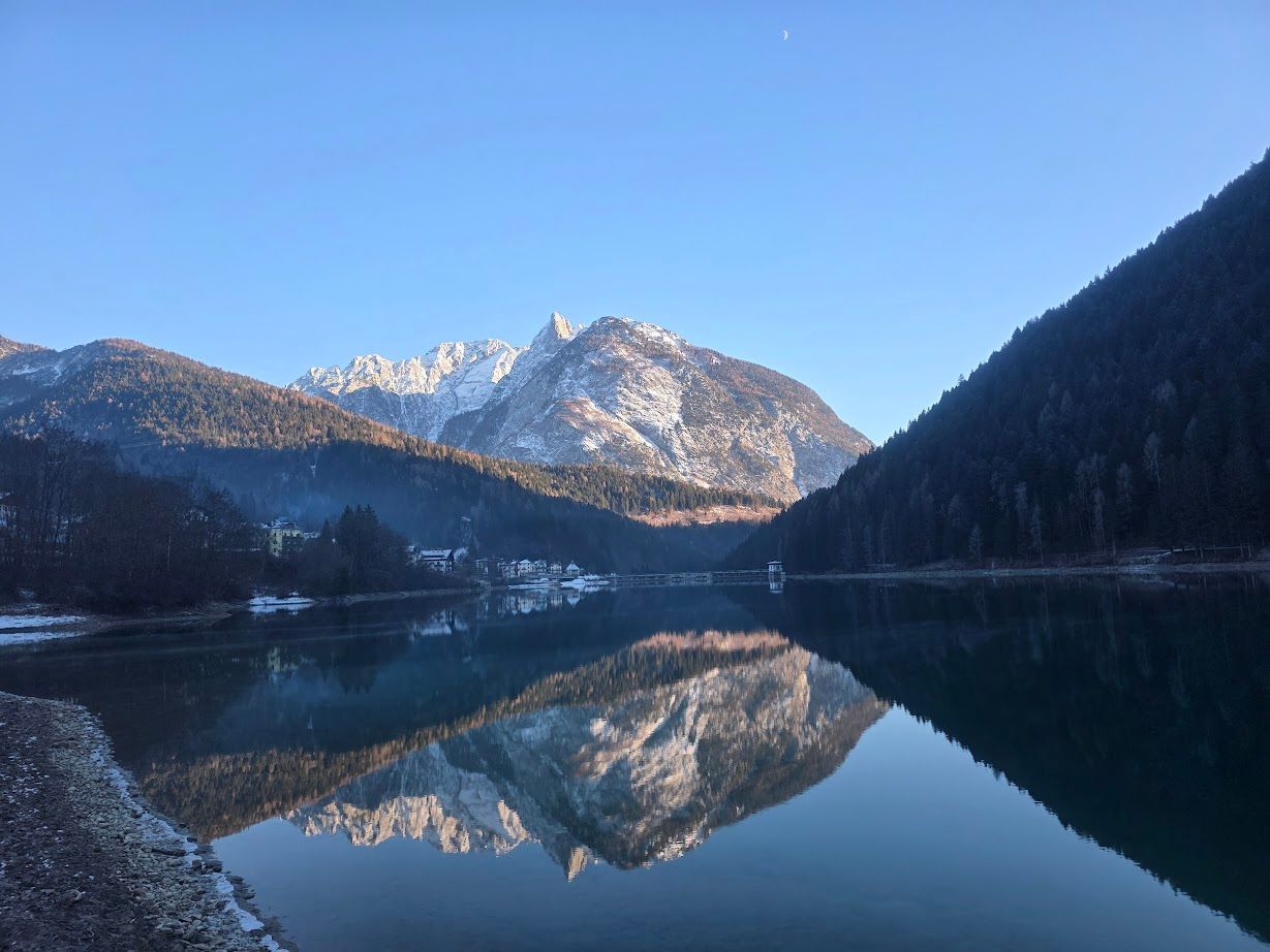 Op ongeveer een kwartiertje rijden van ons huis ligt dit meer. Misschien minder beroemd dan sommige andere meren in de Dolomieten, maar minstens zo indrukwekkend. Het water kleurt door de weerspiegeling van de dennenbomen van blauw tot diep groen, afhankelijk van het licht. Het heeft iets magisch.